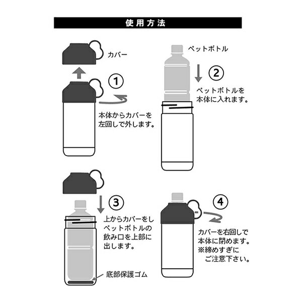 ■サイズ(約):幅9.5×奥行8.5×高さ20.5cm ■本体重量(約):290g ■素材・材質:材質:本体/ステンレス鋼(外面/ポリエステル紛体塗装)、カバー/ポリプロピレン(耐熱温度100度) 、底部保護ゴム/シリコーンゴム(耐熱温度180度)■ 生産国 :中国 ■500ml、600mlのペットボトル兼用※ペットボトルの形状によっては使用できない場合があります