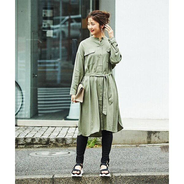 両胸ポケットやバンドカラーなどで旬のミリタリーテイストをしっかり押さえ、裾スリットや共ベルトで女らしさも演出できます。